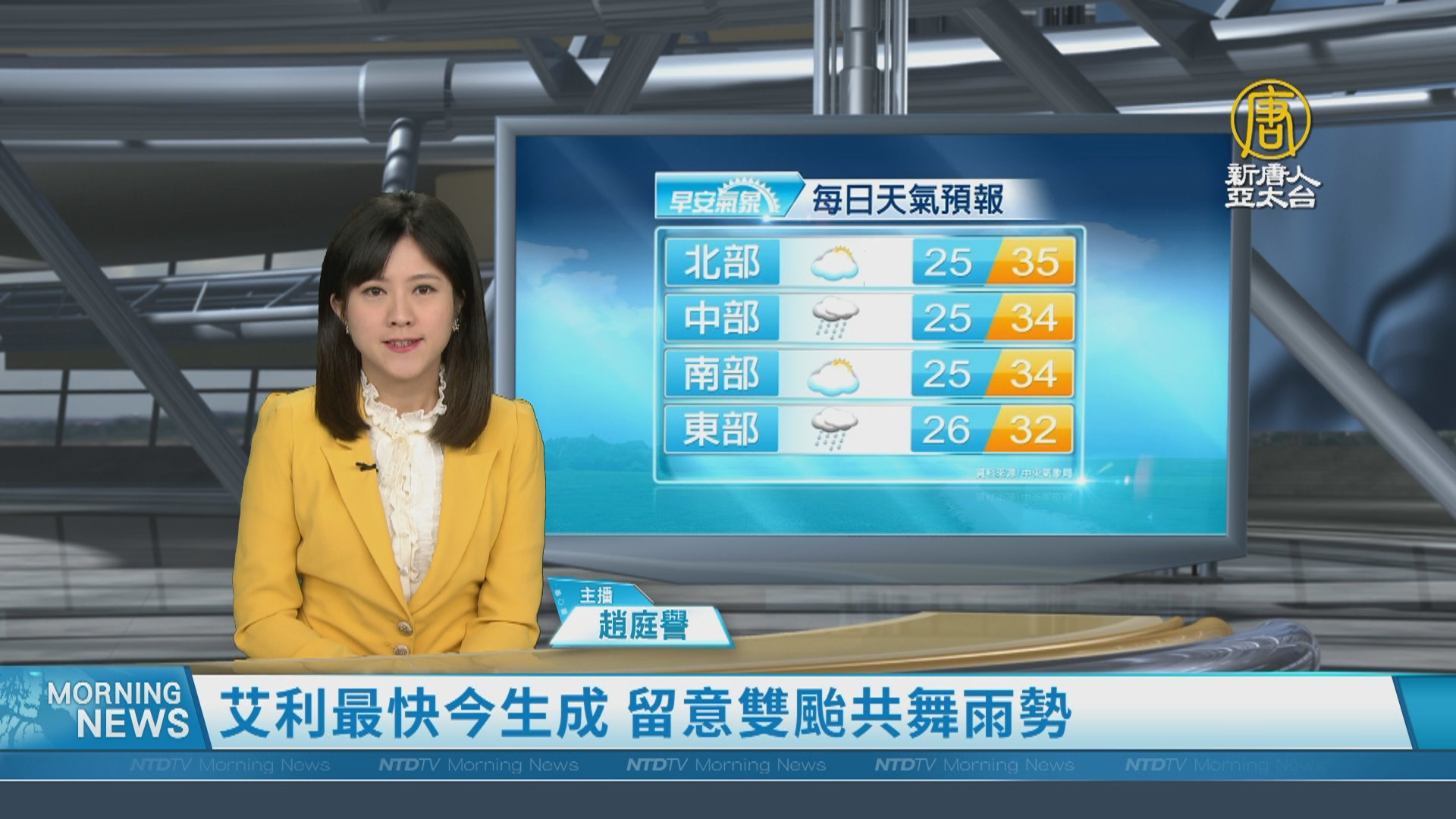 【新唐人亞太台 2022 年 07 月 01 日訊】歡迎您收看7月1日的早安新唐人,我是趙庭譽,先來帶您關心天氣。「芙蓉」颱風已在昨天生成,另一個熱帶性低氣壓,預估今天會轉為颱風「艾利」,受低壓帶影響,今明2天南部及東南部地區,有短暫陣雨或雷雨,提醒觀眾朋友留意,帶您一起來看到國際媒體重要訊息。
