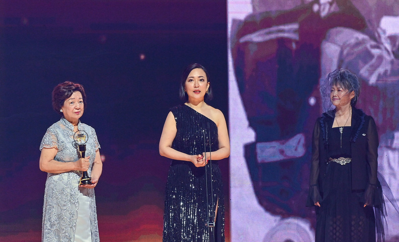 第33屆金曲獎移師高雄舉行頒獎典禮,今年特別貢獻獎得主為已故丘丘合唱團團長邱晨,由遺孀楊麗琴(左)及女兒邱安晨(中)代為領獎,邱安晨除代父親致謝,也盼大家能珍惜這片得來不易、能自由創作的土地。右為獎項引言人金智娟。(圖/台視提供)