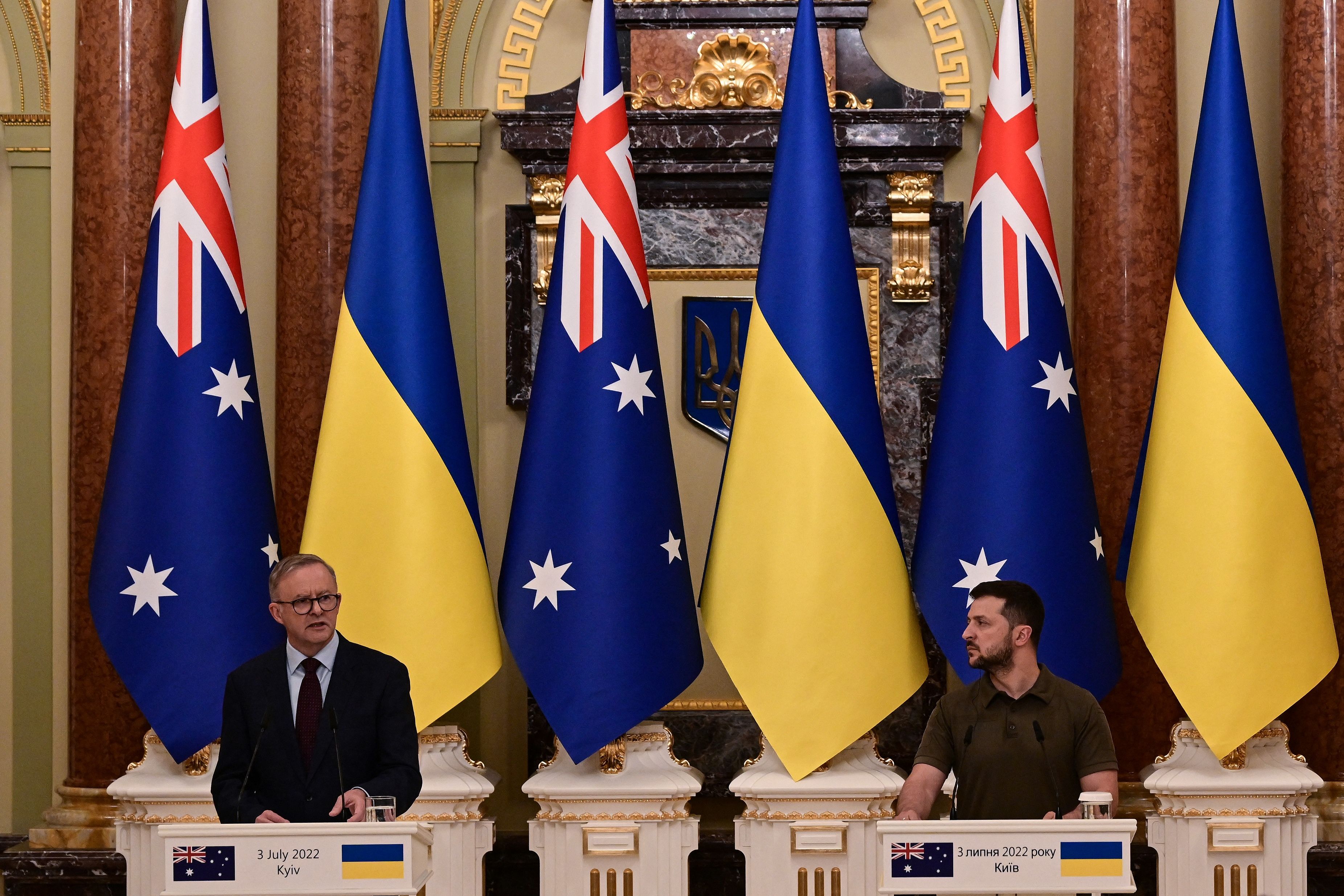 法新社報導,艾班尼斯是史上首位訪問烏克蘭的澳洲總理,他在基輔舉行的記者會上表示,澳洲將向烏克蘭提供「1億元的軍援」,但未具體說明是澳元還是美元;若是澳元,這筆軍援金額相當於6800萬美元。