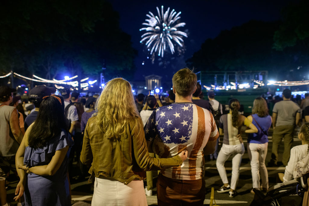 美國煙火業代表說, 部分城市喜歡煙火的民眾在迎接國慶假期之際,卻因為供應鏈中斷,讓他們無法一如過往享受照亮夏日高空的煙火秀。圖為2021年觀眾在費城藝術博物館外觀看獨立日煙花秀照。(圖/GettyImages)