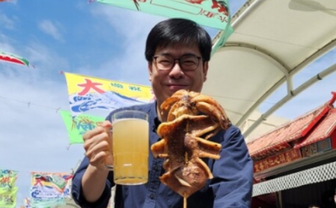 高雄市長陳其邁(圖)6日前往旗津宣傳週末起將舉行的黑沙玩藝節跟啤酒嘉年華,並親身體驗旗津啤酒及烤魷魚。(圖/中央社)