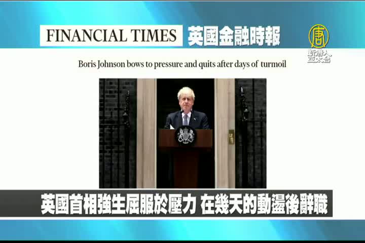 【新唐人亞太台 2022 年 07 月 08 日訊】接著是英國金融時報的報導:英國首相強生屈服於壓力,在幾天的動盪後辭職黨魁。