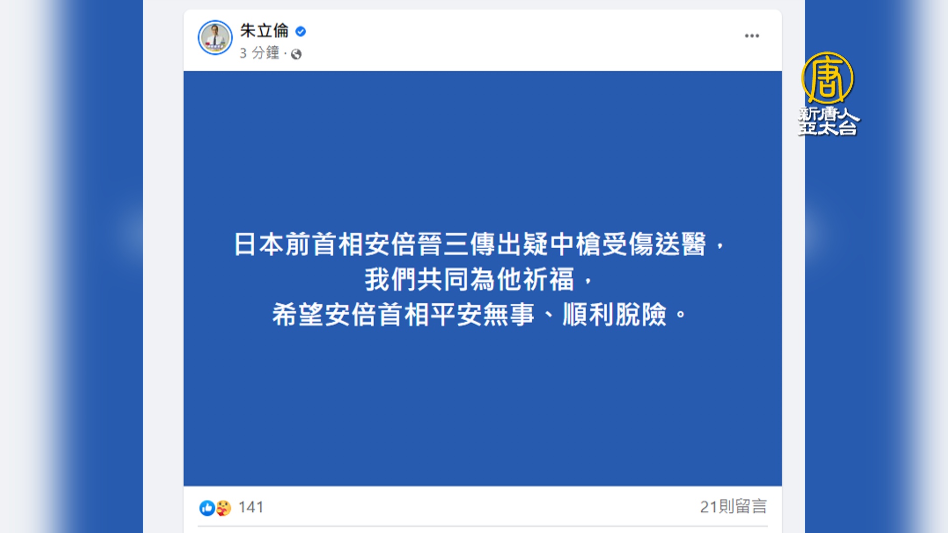 【新唐人亞太台 2022 年 07 月 08 日訊】日本前首相安倍晉三中槍送醫,國民黨主席朱立倫稍早在社群媒體發文,說「我們共同為他祈福,希望安倍首相平安無事、順利脫險。」台灣民眾黨也發聲明,嚴正譴責任何形式的暴力行為。指出安倍晉三任首相期間,多次公開力挺台灣,卸任後仍持續關注台灣動態,是台日友好重要推手,為安倍祈福,願他早日平安脫險。
