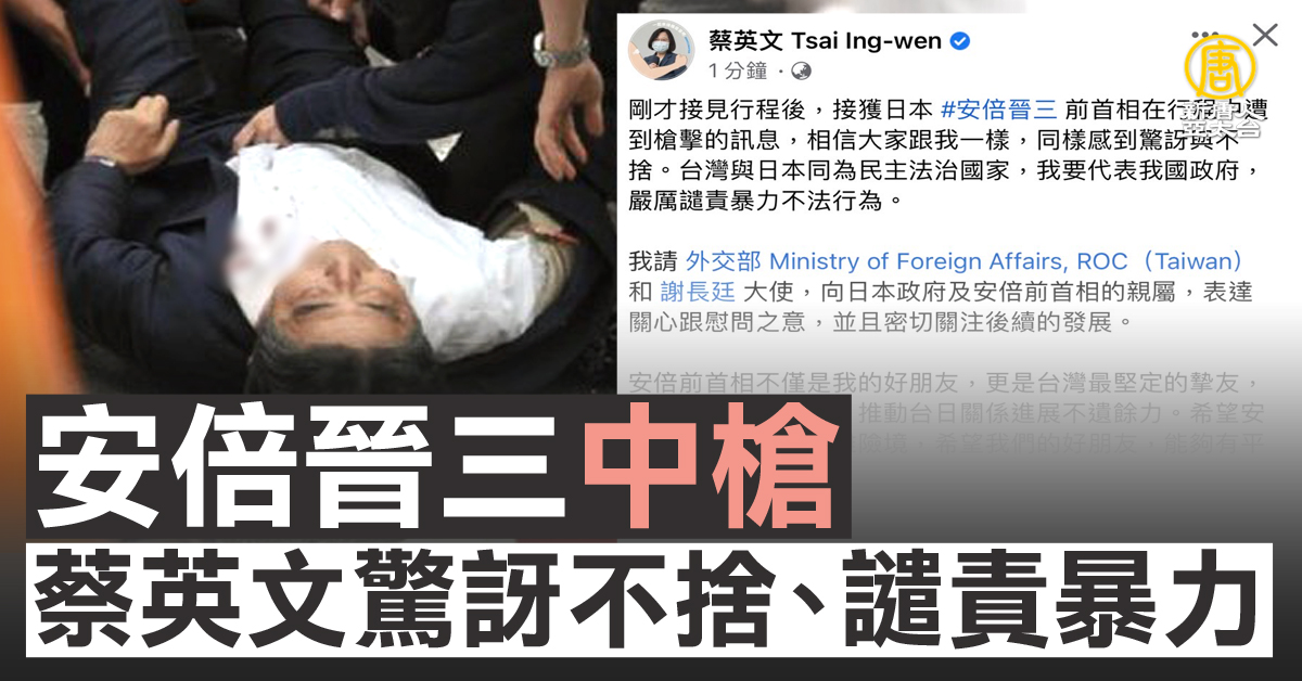 【新唐人亞太台 2022 年 07 月 08 日訊】總統蔡英文剛剛在臉書發文,對日本前首相安倍晉三在行程中遭到槍擊,感到驚訝與不捨。表示台灣與日本同為民主法治國家,要代表我國政府,嚴厲譴責暴力不法行為。 蔡英文表示,已請外交部、謝長廷大使,向日本政府及安倍前首相親屬,表達關心跟慰問之意,並且密切關注後續的發展。蔡英文說,安倍前首相不僅是她的好朋友,更是台灣最堅定的摯友,長年以來力挺台灣,推動台日關係進展不遺餘力。希望安倍前首相能儘速脫離險境,希望能夠有平安的消息傳來。