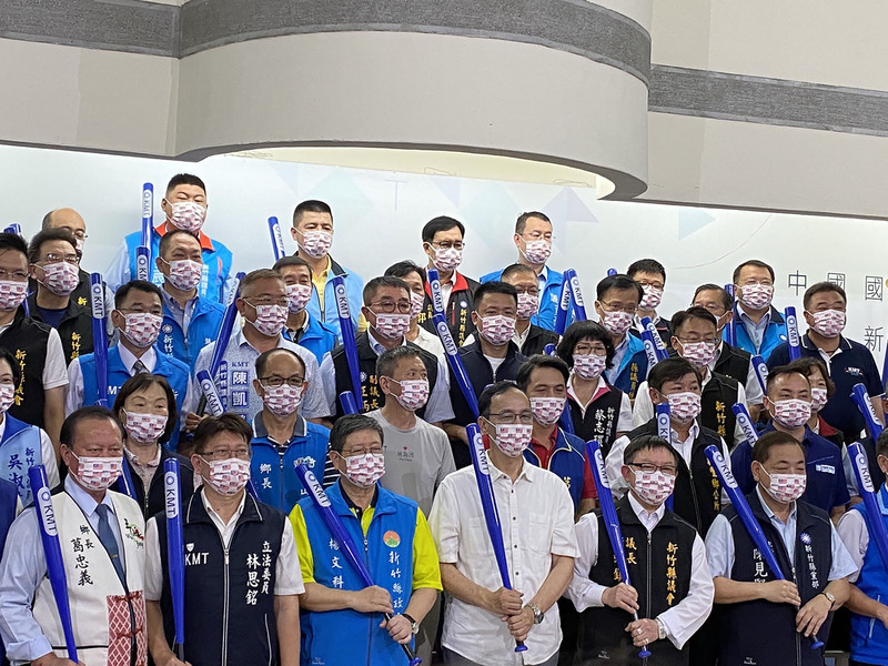 國民黨新竹縣黨部8日舉行鄉鎮市長、縣議員提名發布記者會,黨主席朱立倫(前右3)出席表示,將帶領國民黨團結一心,盼在各鄉鎮市揮出全壘打。(圖/中央社)