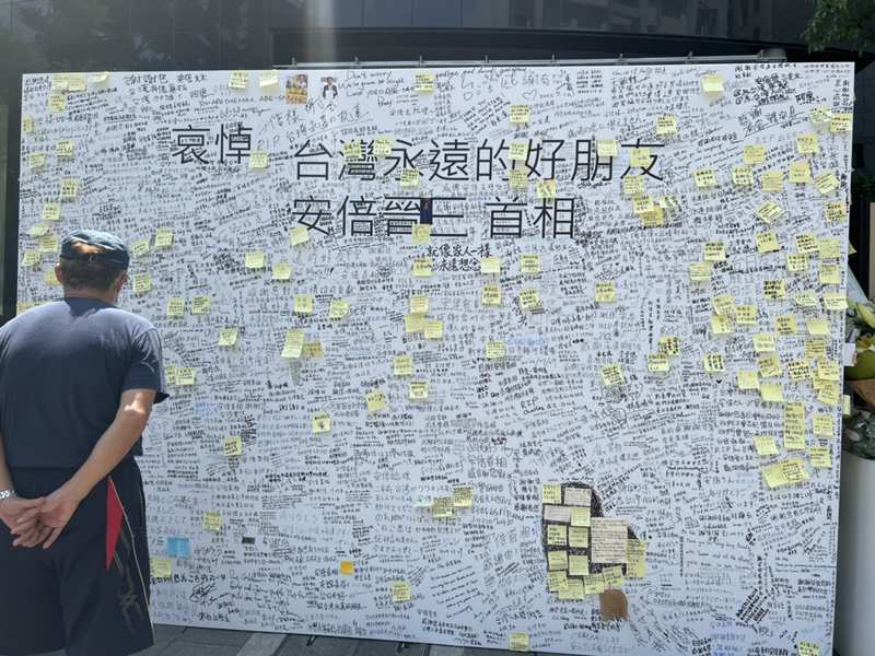 2022-07-09 21:32:48日本前首相安倍晉三8日在奈良街頭助選時被槍擊身亡,舉世震驚。位於台北市慶城街的日本台灣交流協會外,9日出現民間自發豎立約兩米高的大型留言牆,許多民眾以中、日文簽名留言,追悼這位「台灣永遠的好朋友」。