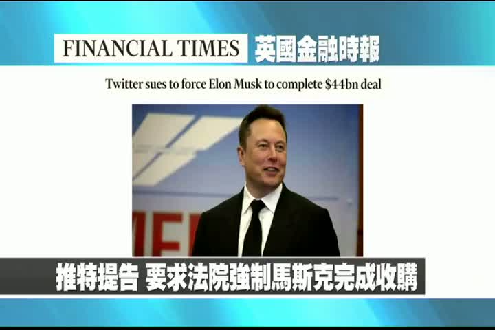 【新唐人亞太台 2022 年 07 月 13 日訊】接著是英國金融時報的報導:推特提起訴訟,要求法院強制特斯拉執行長馬斯克,完成價值440億美元,約1.3兆元台幣的收購協議。