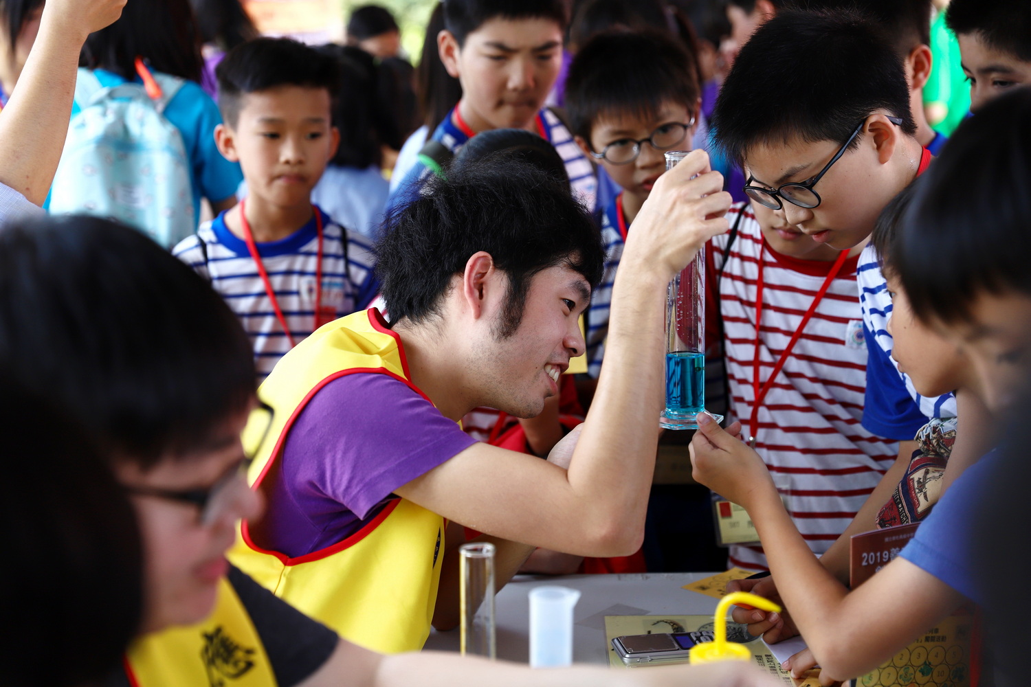 嘉大學生透過科學闖關,教導學生分辦溶液的形態。(嘉大提供)