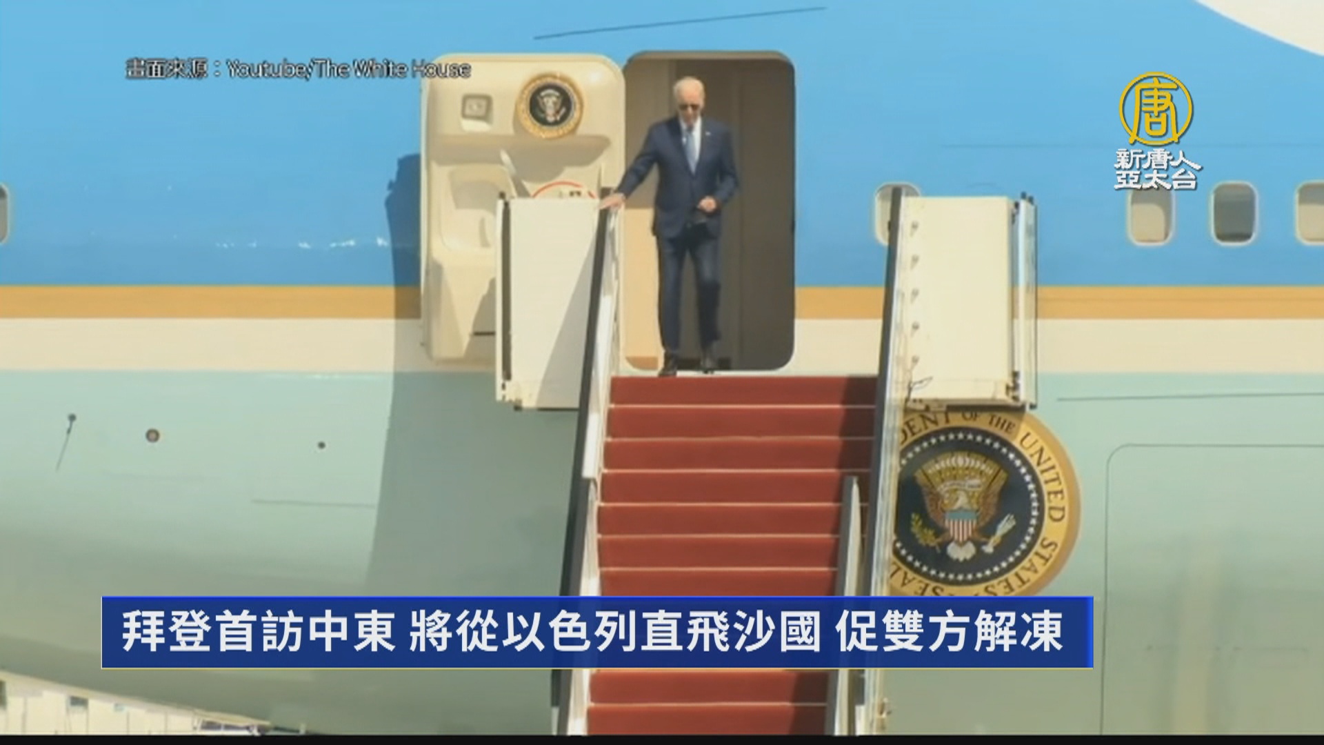【新唐人亞太台 2022 年 07 月 13 日訊】美國總統拜登在剛剛稍早抵達以色列第二大城特拉維夫,為他為期4天的首次中東訪問行程揭開序幕。拜登這次中東行的第一站是以色列,接著他將前往由巴勒斯坦法塔組織控制的約旦河西岸,最後再從以色列直飛沙烏地阿拉伯,寫下歷史。這次與他同行的,還有美國國務卿布林肯以及國安顧問蘇利文。分析認為,從拜登先訪以色列、後訪沙烏地阿拉伯來看,似乎是希望透過促進以沙關係,進一步達成針對伊朗的聯盟,以換取沙國增產石油,以配合西方對俄羅斯的制裁,同時抑制油價飆升。