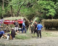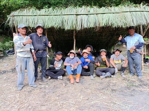 部落男青年與耆老學習搭建獵寮。(高雄市政府原民會 提供)