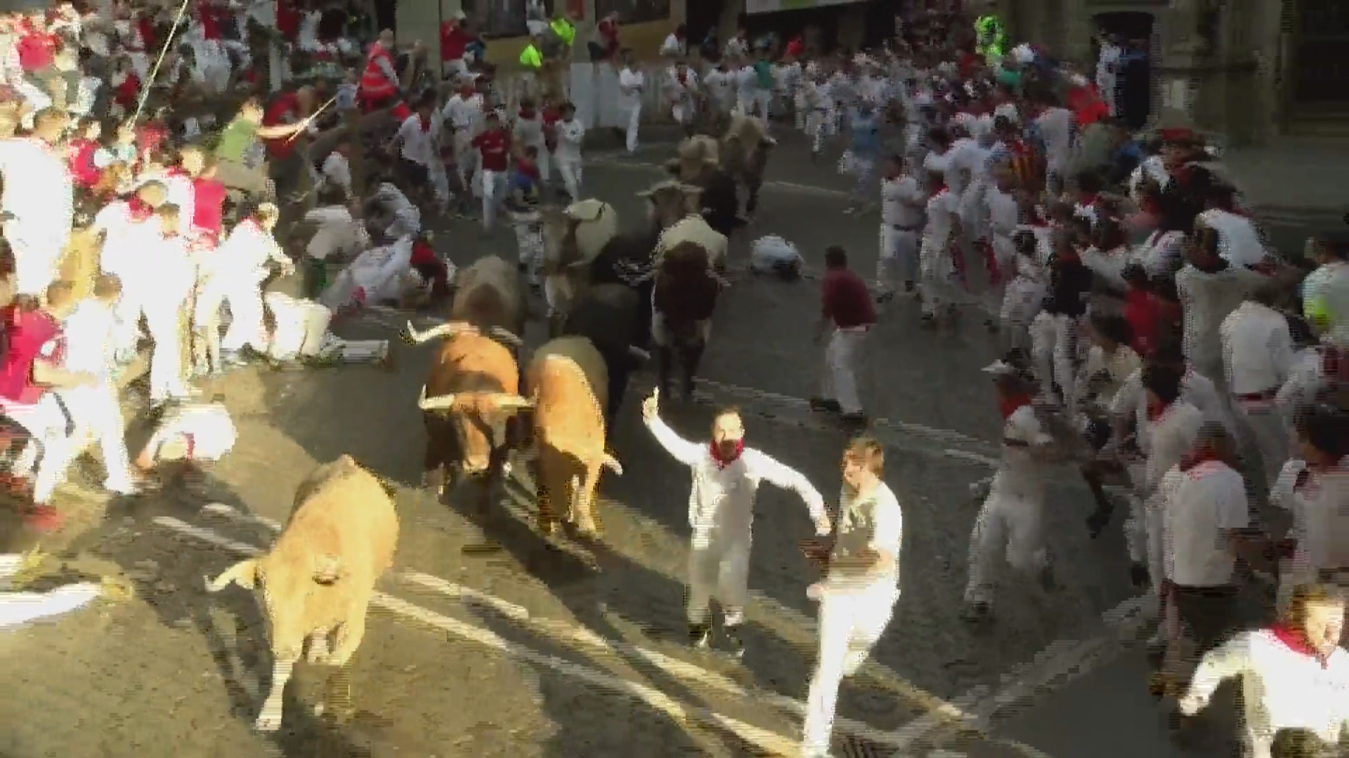 7月7日一大早,牛欄的門被打開,生龍活虎的鬥牛們很快就搞清了方向,奔跑了出去。與此同時,參加「奔牛節」的人們正聚集在街上,焦急地等待著鬥牛的出現。突然人群騷動了起來,喊聲四起,原來鬥牛已經來到眼前了,趕快奔跑吧。奔跑者的腎上腺激素瞬間飆升,他們在狹窄的街道中一路狂奔。而周圍的觀眾也在激動的喊叫和鼓掌,為奔跑者加油打氣。整場活動持續了2分35秒.