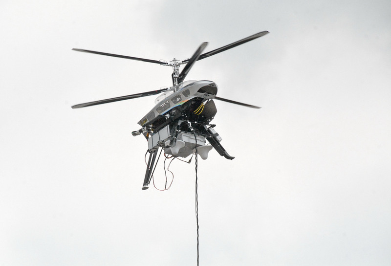 中華電信與雷虎科技合作「空中無線基地台系統」,由無人機搭載無線基地台發射器升空,透過電力與訊號纜線連接地面的行動衛星車輛,作為救災通訊應用。(圖/中央社)