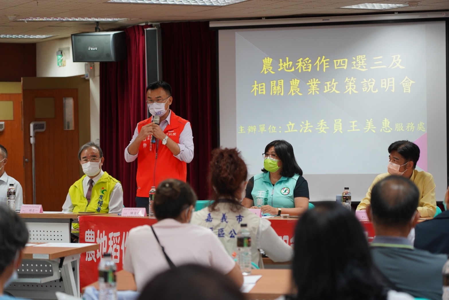 【新唐人亞太台 2022 年 07 月 14 日訊】農委會110年起實施「稻作四選三」措施,但嘉義市農田未經都市計畫,農民擔心不配合休耕或轉作,繳交公糧的資格就會被取消。立委王美惠今天(14日)邀請農委會陳吉仲主委南下嘉義市農會與農民座談,解除農民心中的疑慮與困擾。