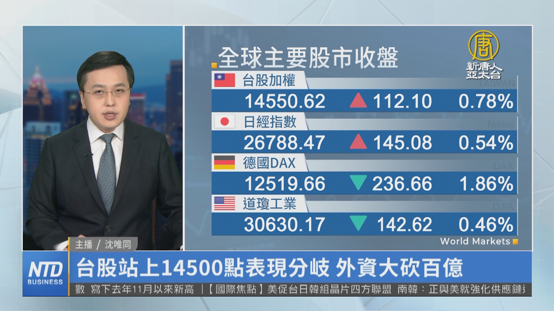【新唐人亞太台 2022 年 07 月 15 日訊】新聞一開始帶您看到,美國公布CPI數據後,美股周四表現分歧,尤其美國摩根大通、摩根士丹利,雙雙公布獲利下滑、並警告景氣有下行風險。台股方面雖然有國安基金護盤,但各產業表現不一,除了台積電成為主要上攻指標,但航運、金融股表現差強人意,加權指數收盤上漲112點,收在14550.62點。不過三大法人合計賣超84.51億,只有投信站在買方,外資則是大砍超過百億。