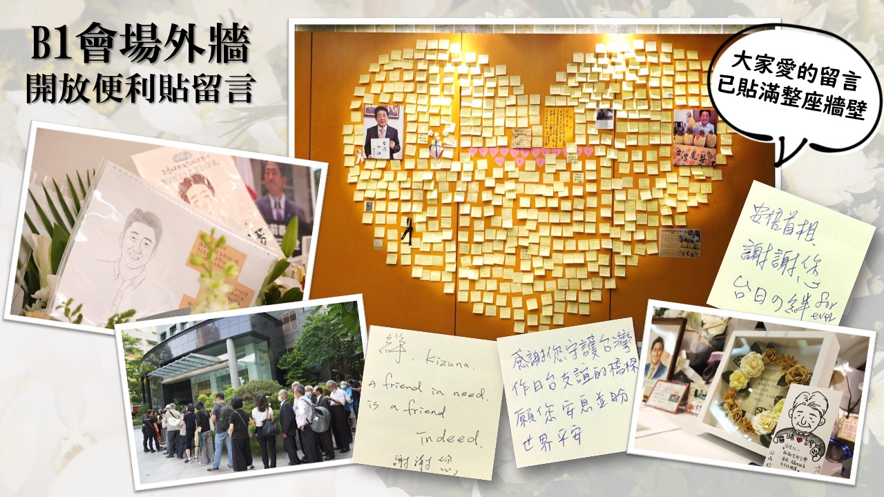 大樓外的兩個留言版都已寫滿,日台交流協會表示,今起特別開放地下一樓外牆作為留言區,讓民眾以便利貼留下想對安倍說的話,愛的留言也迅速貼滿整面牆壁。