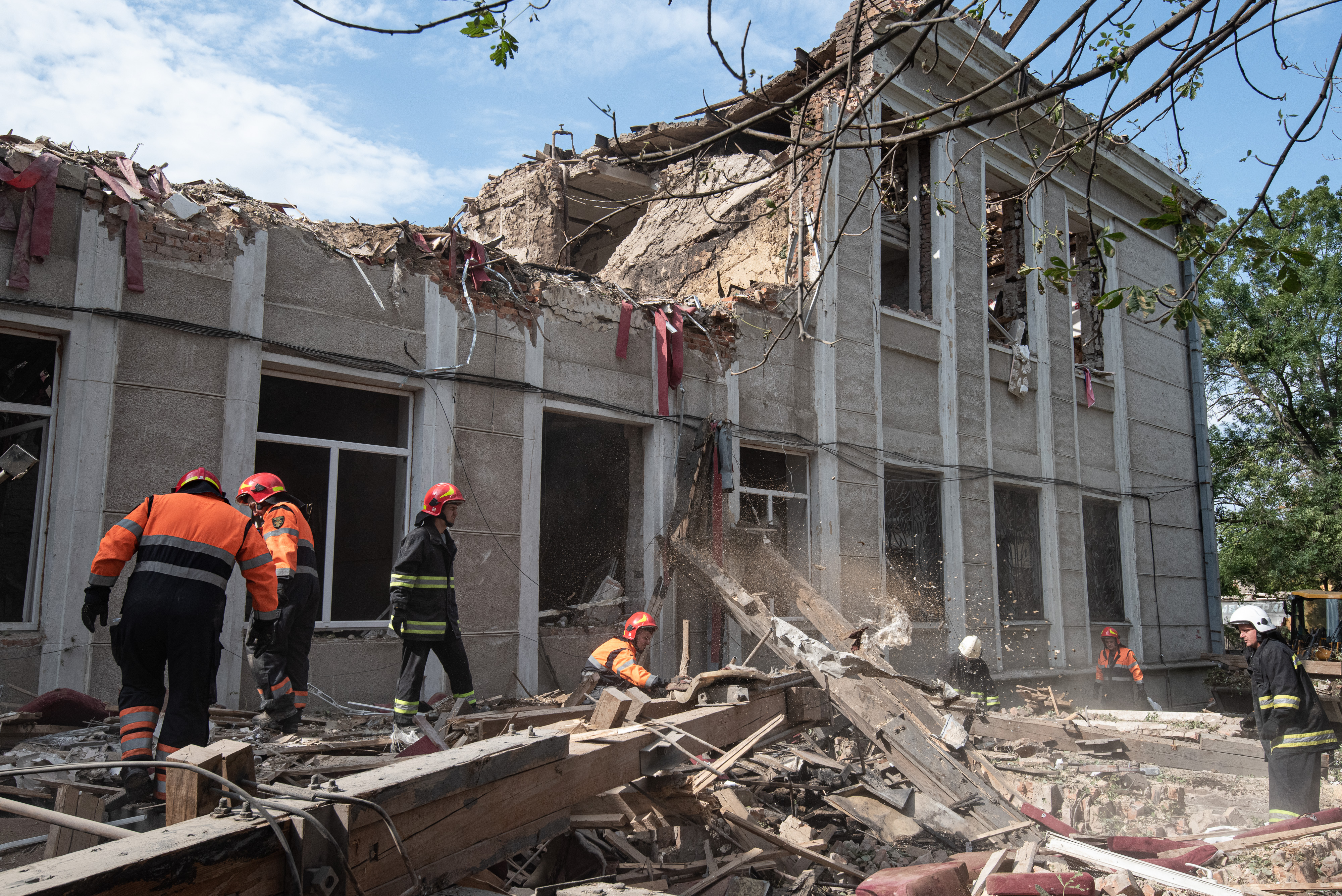 烏克蘭國防部發言人莫圖茲雅尼克15日說,高達70%的俄羅斯飛彈攻擊是針對和平城市與非軍事目標。圖為救難人員15日在文尼察清理一座受損嚴重的建築物。(圖/GettyImages)