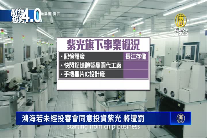 【新唐人亞太台 2022 年 07 月 16 日訊】歡迎回來,鴻海集團旗下工業富聯(FII),傳出斥資人民幣98億元,約新台幣435億元,入股宣布破產重整的中國紫光集團。有分析認為,鴻海持續擴大半導體領域布局,不過具體成效,專家態度保留。另外,外媒引述消息人士的說法指出,如果鴻海在台灣投審會尚未同意的情況之下,對中國紫光集團投資,可能被處以新台幣 2,500 萬元的罰款。