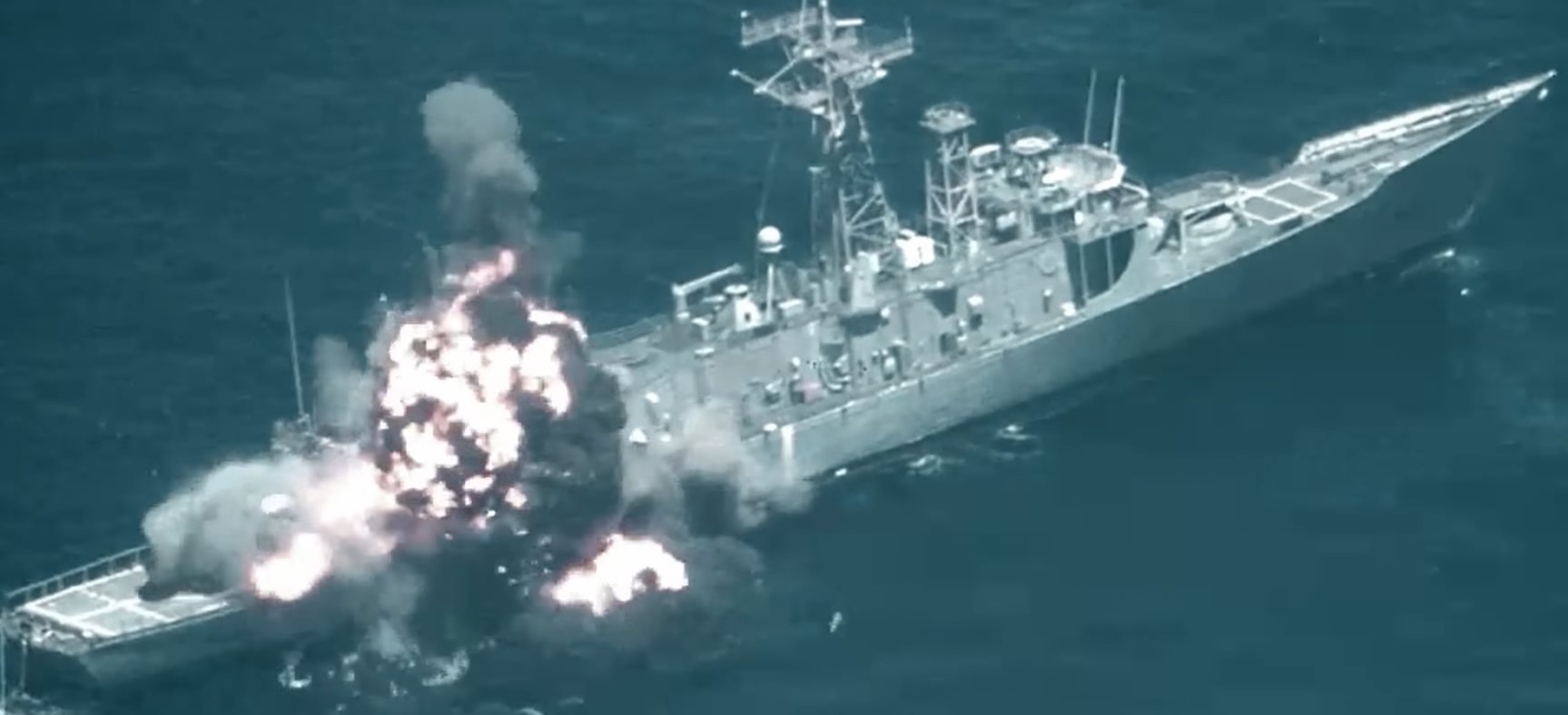 美軍主導的環太平洋軍事演習(RIMPAC)在夏威夷外海登場,據臉書公開影片,多國船艦和軍機朝已退役的巡防艦魯尼戴維斯號(USS Rodney M. Davis)進行實彈射擊。(圖/翻攝自FB@RIMPAC)