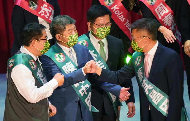 民進黨第20屆第1次全國黨員代表大會17日在台北國際會議中心舉行,台南市長參選人黃偉哲(左至右)、台北市長參選人陳時中、新北市長參選人林佳龍、台中市長參選人蔡其昌互相加油打氣。(圖/中央社)