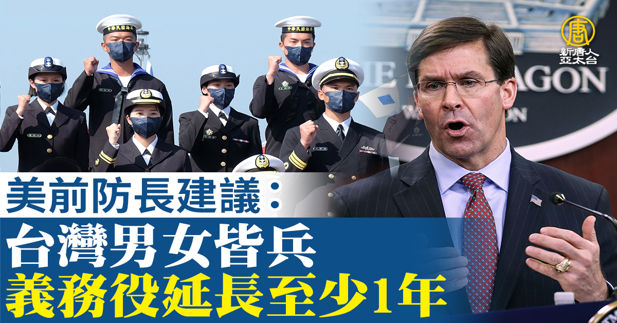 【新唐人亞太台 2022 年 07 月 19 日訊】前美國國防部長艾斯培今天建議,台灣應大幅增加國防預算,延長義務役期,讓年輕台灣男性、女性在軍隊中服役至少1年,並進一步加強後備軍人的動員能力,才能讓台灣與美國等盟友的防衛同步化。
