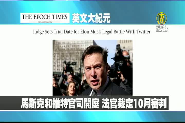 【新唐人亞太台 2022 年 07 月 20 日訊】首先來看到美國大紀元英文版報導:德拉瓦州法官19日表示,推特和馬斯克的官司首次開庭,將在10月進行審判,審判時間更接近推特提議的時間。