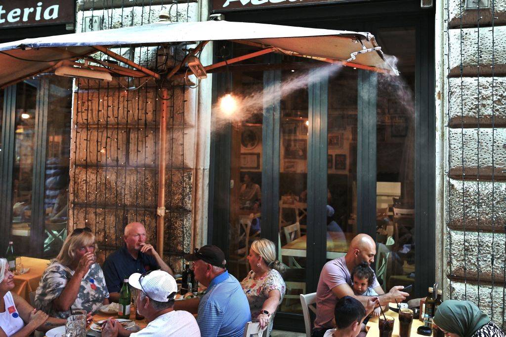 世界氣象組織(WMO)表示,歐洲熱浪將在20日進入高峰,但直到下週中期,氣溫仍可能高。圖為19日在熱浪中,遊客們坐在義大利羅馬市中心一露天餐廳裡,躲在傘蔭下,希望水蒸汽噴射消暑緩解。(圖/GettyImages)