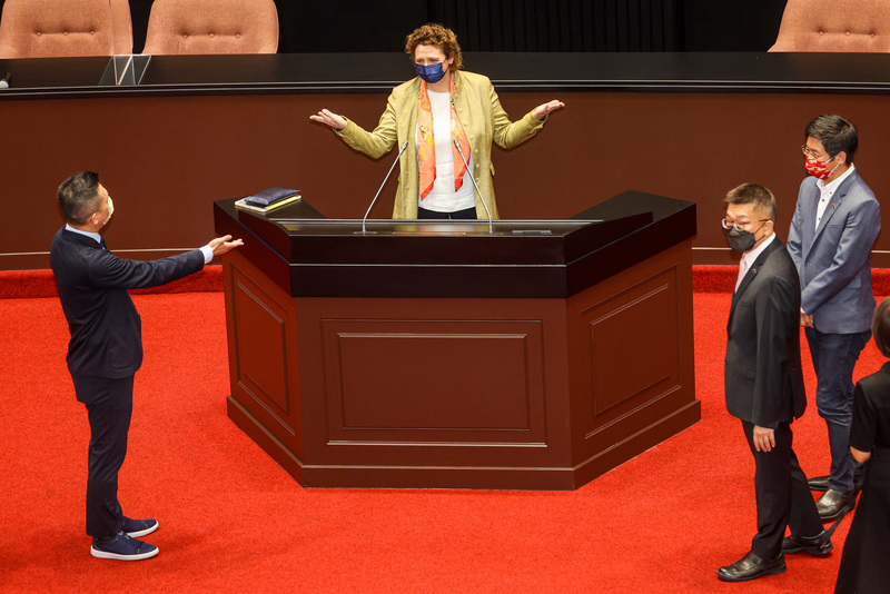 歐洲議會副議長畢爾(Nicola Beer)(圖中)20日參訪立法院,立法院副院長蔡其昌(圖右2)在議場內邀請畢爾上發言台,體驗我國國會文化。(圖/中央社)