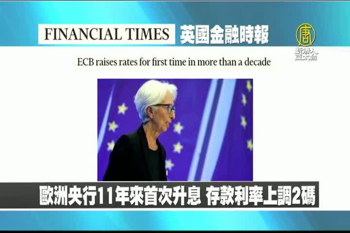 【新唐人亞太台 2022 年 07 月 22 日訊】接著是英國金融時報的報導:歐洲央行11年來首次升息 ,存款利率上調2碼。
