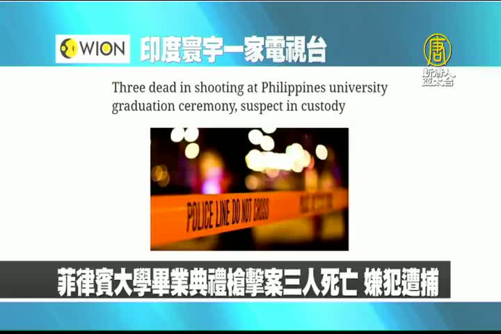 【新唐人亞太台 2022 年 07 月 25 日訊】最後是印度寰宇一家電視台報導:週日菲律賓首都馬尼拉一所大學舉行的畢業典禮上發生槍擊事件,造成三人死亡,兩人受傷,當局已逮捕嫌犯。