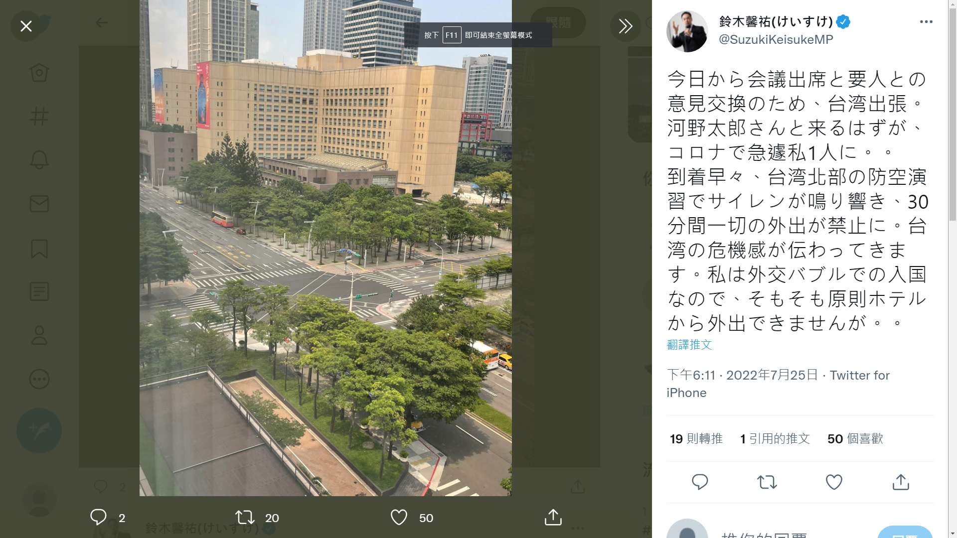 鈴木馨祐在推特(Twitter)貼出一張台北市政府附近空無一人的照片,他表示,原本應該和日本前外務大臣河野太郎一同訪台,但因為Covid-19疫情,匆忙間只有他獨自前來。