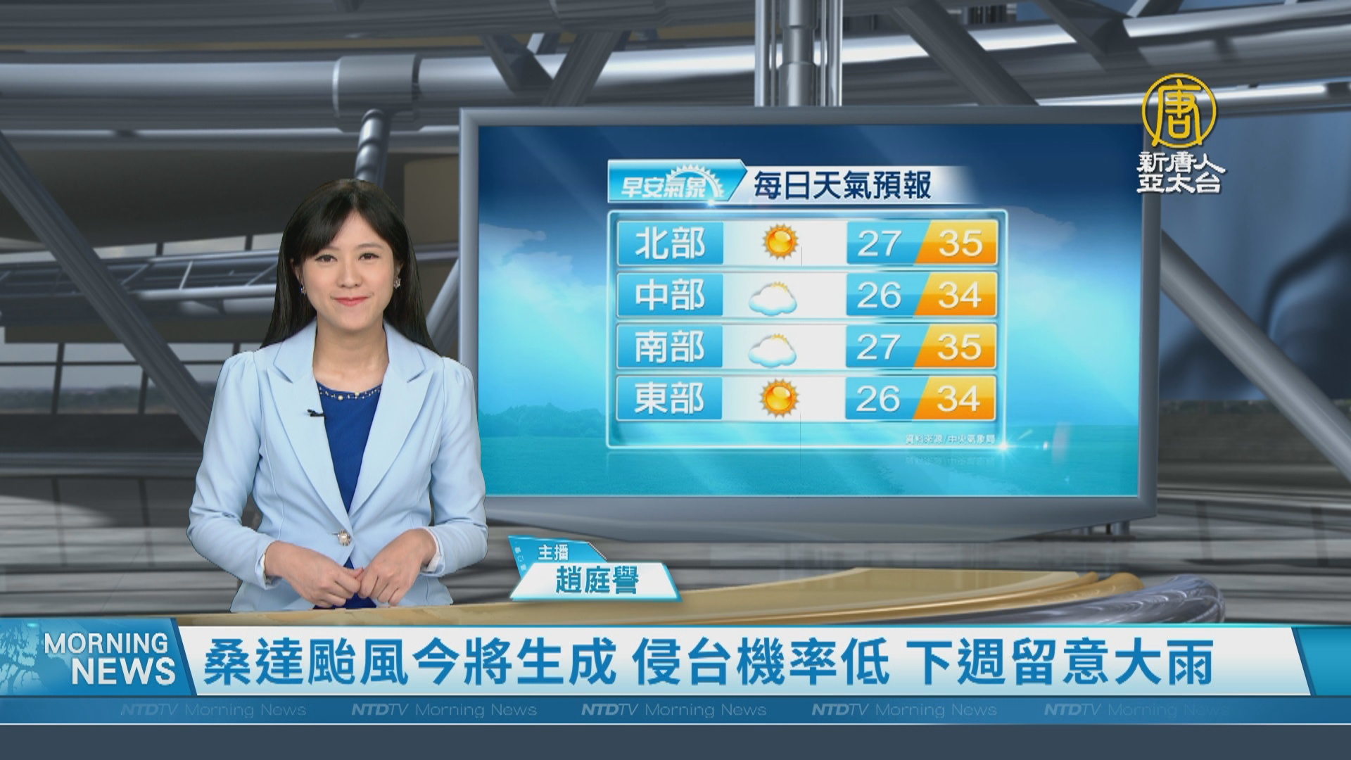 【新唐人亞太台 2022 年 07 月 28 日訊】歡迎您收看7月28日的早安新唐人,我是趙庭譽,先來帶您關心天氣。氣象局表示,輕度颱風「桑達」有機會在今天生成。氣象專家分析,「桑達」侵台機率低,不過,下周一、下周二「季風環流」逐漸向西北靠近並通過台灣,會為各地帶來比較大量的降雨,提醒觀眾朋友要特別留意。帶您一起來看到國際媒體重要訊息。