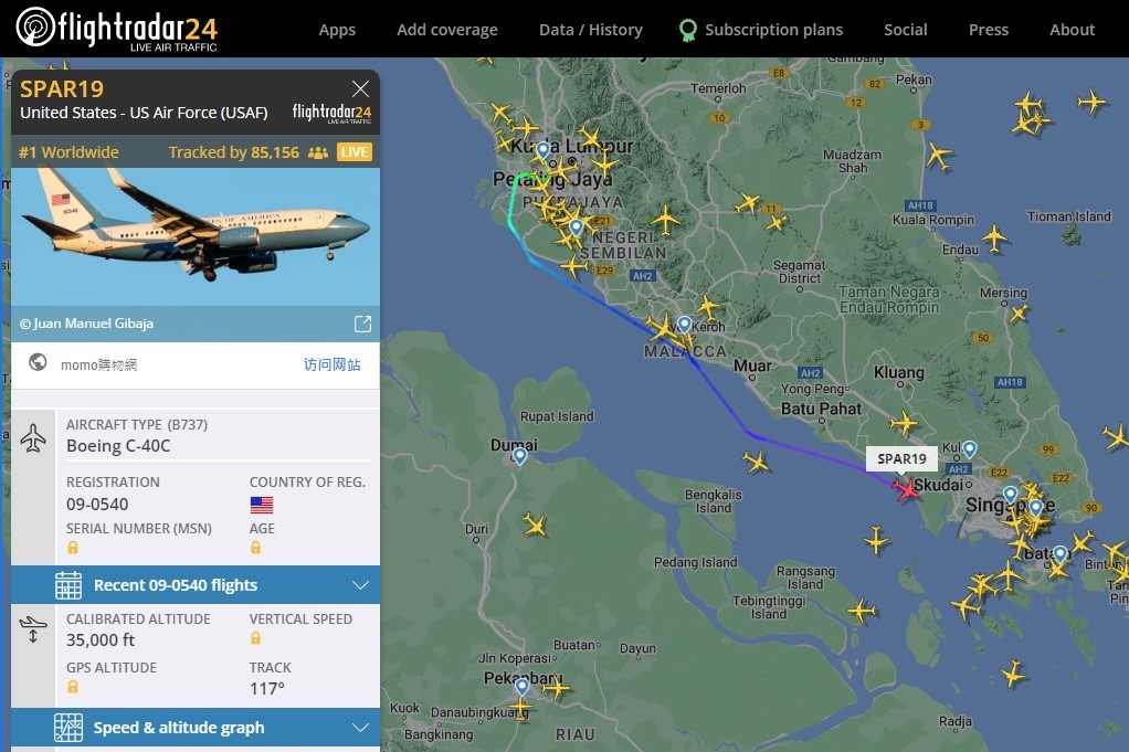 美國眾議院議長裴洛西的行政專機,已經在台灣時間15:42從馬來西亞蘇丹阿都阿兹沙機場起飛,目的地是何處暫時不得而知。(圖/翻攝自flightradar24.com)