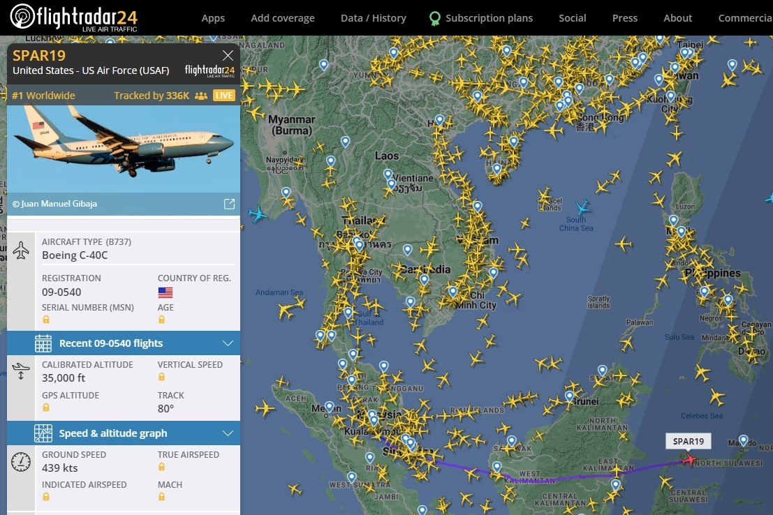 美國眾議院議長裴洛西的行政專機,目前在印尼上空的SPAR19,已吸引超過33萬人在即時航班飛行資訊網如Flightradar24平台上同步追蹤。(圖/翻攝自flightradar24.com)