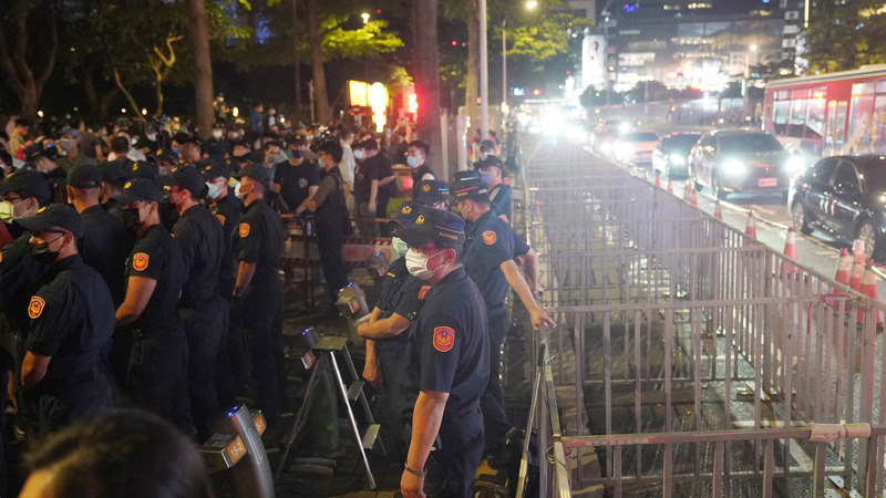 新北市警方2日表示,美國聯邦眾議院議長裴洛西若造訪白色恐怖景美紀念園區,警方已做好維安整備及警力部署。為避免抗議團體在君悅酒店滋事,警方架設層層拒馬在場戒備。(圖/中央社)