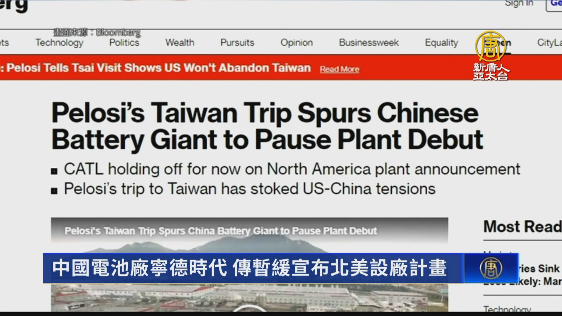 【新唐人亞太台 2022 年 08 月 03 日訊】美國眾議院議長裴洛西(Nancy Pelosi)訪台,中共升高台海緊張,外媒報導,寧德時代將暫緩發布北美設廠計畫。報導指出,北美廠耗資數十億美元,計劃為特斯拉、福特汽車等美國車廠提供電池。不過,對於這項消息,寧德時代沒有回應,特斯拉也沒有回應採訪,福特拒絕評論。外媒報導指出,據了解,寧德時代赴墨西哥或美國設廠,仍是考慮中的計畫,目前還沒有放棄建廠構想。