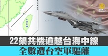 22架共機逾越台海中線 全數遭台空軍驅離