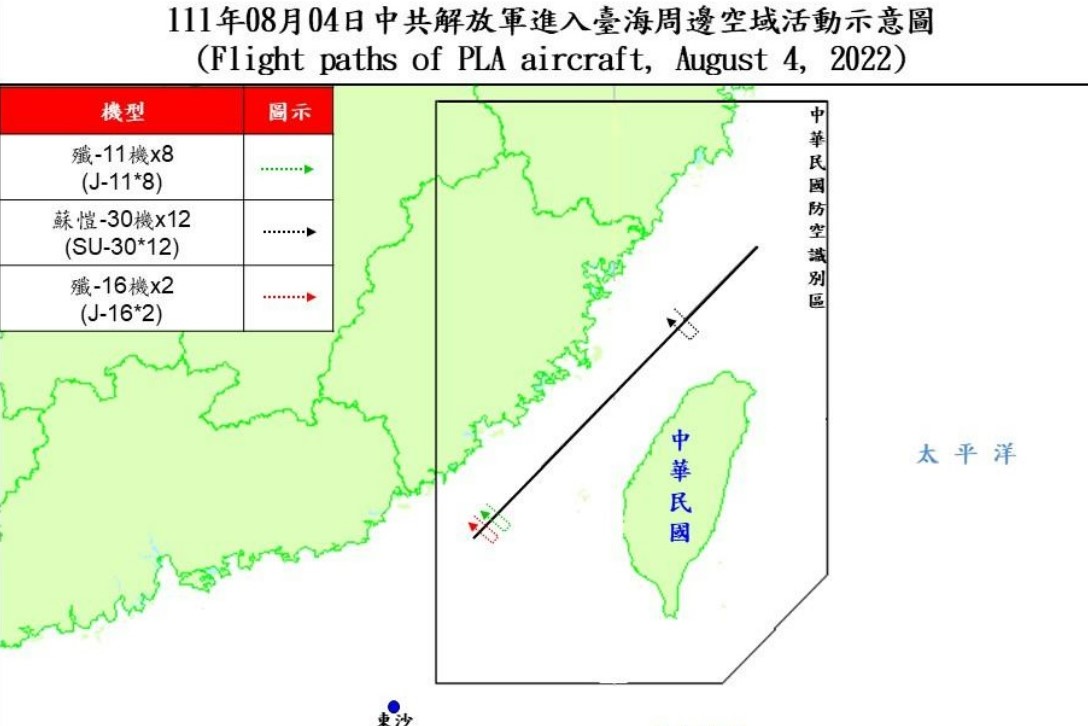 【新唐人亞太台 2022 年 08 月 04 日訊】中共今天在台灣周邊6處海域操演,實彈射擊11枚東風系列彈道飛彈。空軍今天晚間發布共機動態,共有22架戰機(8架殲11、2架殲16、12架蘇愷30)穿越台灣海峽中線。