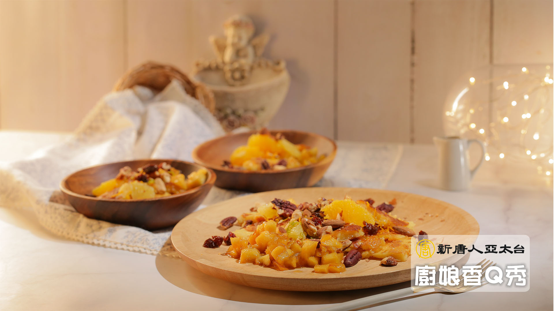 4. 盛盤,盤飾焦糖蘋果、南非柑橘瓣、橙皮、堅果碎。