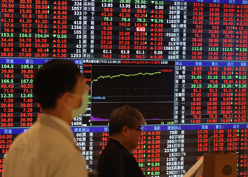 一掃中共軍演利空衝擊,在金融監督管理委員會研擬限空令及國安基金持續關注盤勢下,台股5日開高走高,狂飆超過300點,週線收連5紅,一舉站回萬五。(圖/中央社)