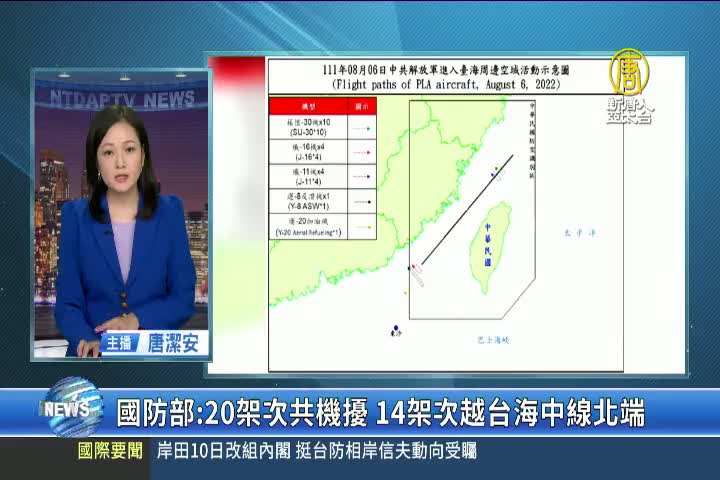 【新唐人亞太台 2022 年 08 月 06 日訊】中華民國國防部今晚發布資訊指出,截至今天下午5點止,有20架次共機、14艘次共艦,在台海周邊演習。其中,有14架次共機,包括10架蘇愷30、4架殲11,逾越台灣海峽中線北端,國軍透過空中兵力、艦艇及岸置飛彈應處。