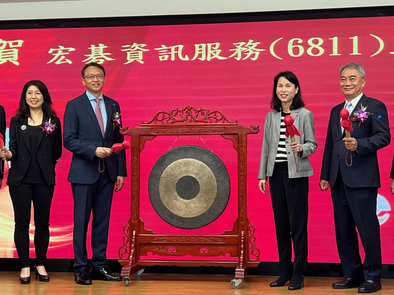宏碁旗下雲端與資訊服務供應商宏碁資訊9日掛牌上櫃,宏碁資訊董事長陳俊聖(左2)、總經理周幸蓉(左1)舉行敲鑼儀式。(圖/中央社)