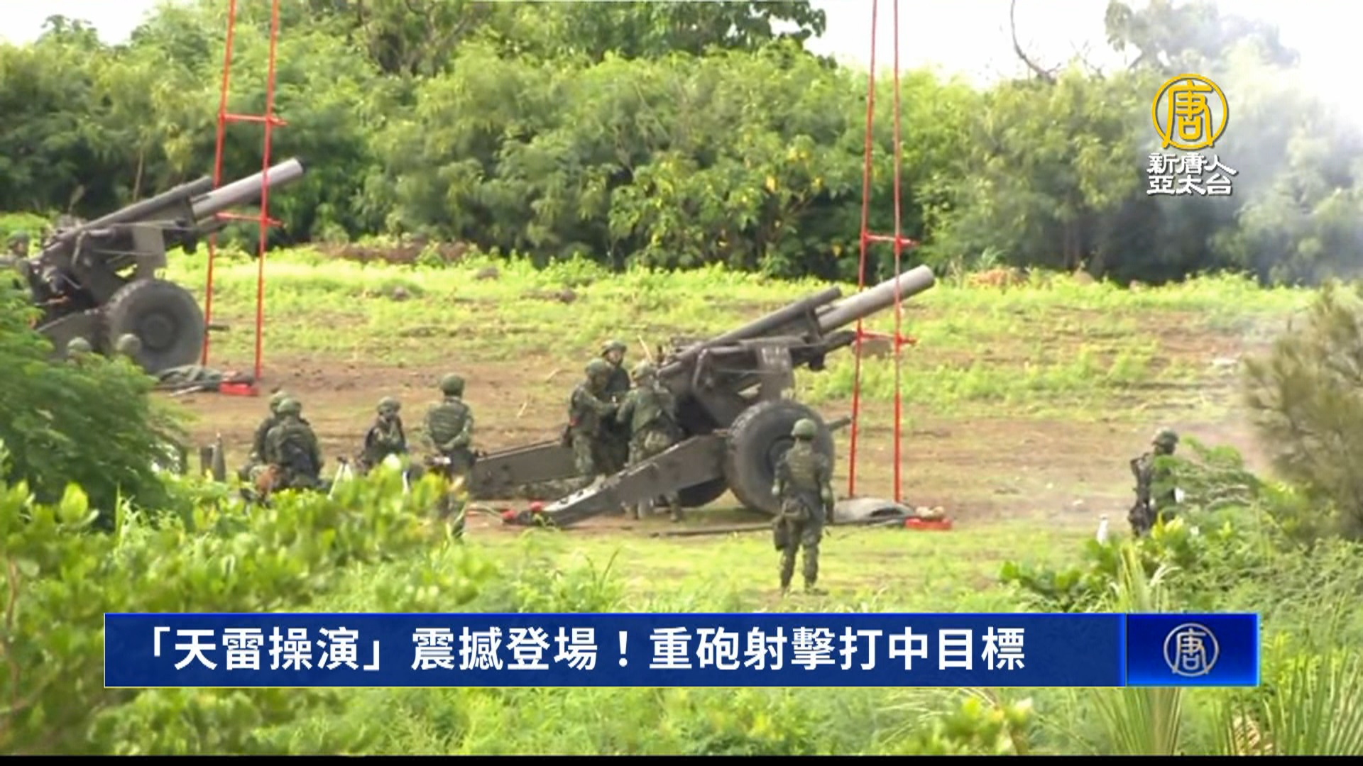 【新唐人亞太台 2022 年 08 月 09 日訊】國軍年度天雷操演,今天(8月9日)在屏東的車城滿豐訓場登場,儘管天候不佳,不過軍方還是依照預定時間進行操演,而這一次重砲射擊主要以155榴彈砲為主,在海面打出巨大浪花,精準命中目標,是反登陸的重要裝備,另外聯勇操演,也同步在保力山來進行。