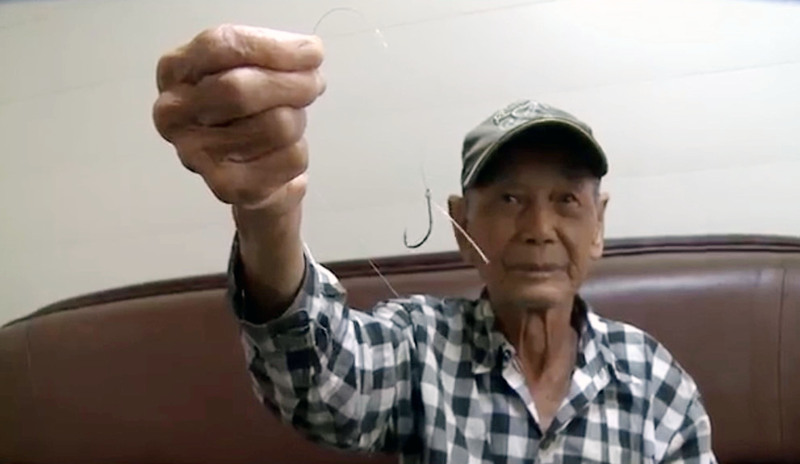 張佐在兒子陪同下,開著小漁船從新港漁港出海,航行到外海,這片海域陪伴他約60年,接著熟練地施放延繩;出發前他已經俐落地將魚鉤綁好,雖然視力衰退,但綁魚鉤卻是駕輕就熟。