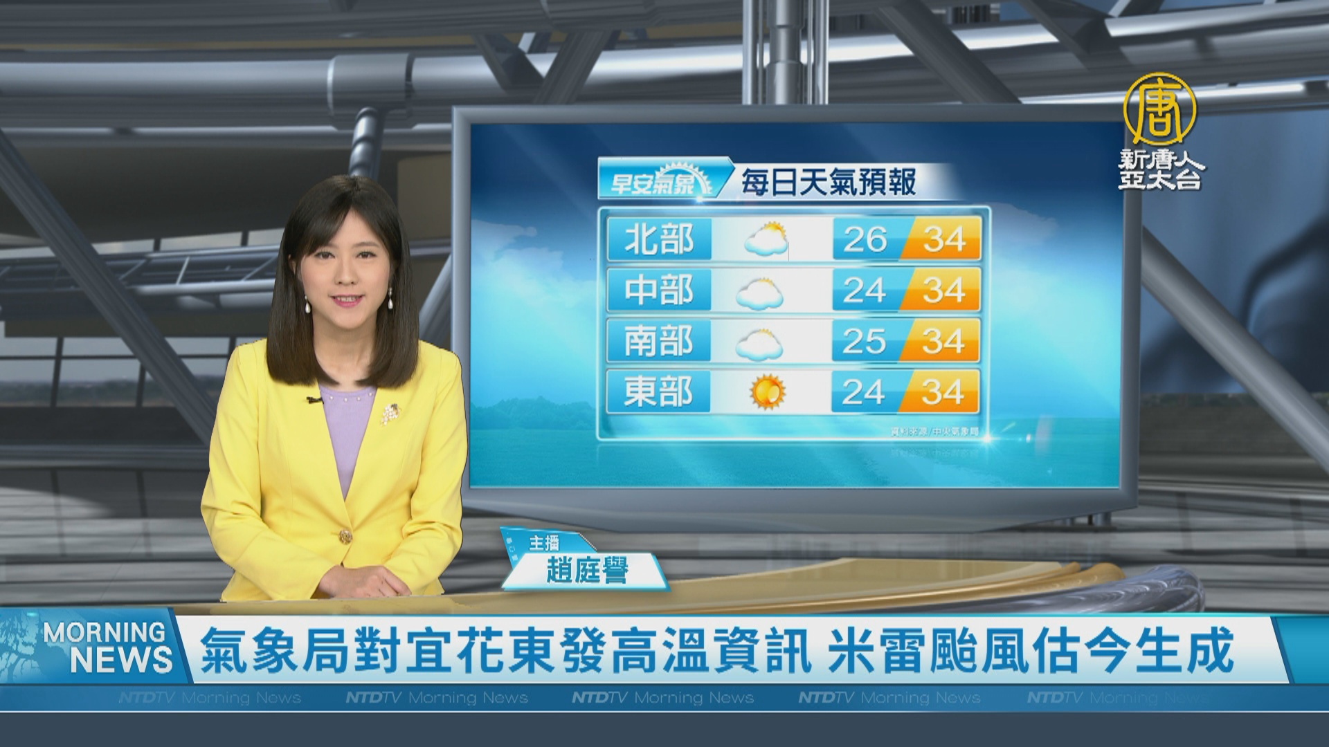 【新唐人亞太台 2022 年 08 月 11 日訊】歡迎您收看8月11日的早安新唐人,我是趙庭譽,先來帶您關心天氣。氣象局今天清晨六點半左右,對三個縣市發布高溫資訊,提醒民眾,台東縣地區有連續出現38度極端高溫的機率,宜蘭縣、花蓮縣地區有連續出現36度高溫的機率。另外,位在日本南方海面的熱帶性低氣壓,預估最快今天下半天,成為今年第8號颱風「米雷」,初估對台灣沒直接影響。帶您一起來看到國際媒體重要訊息。