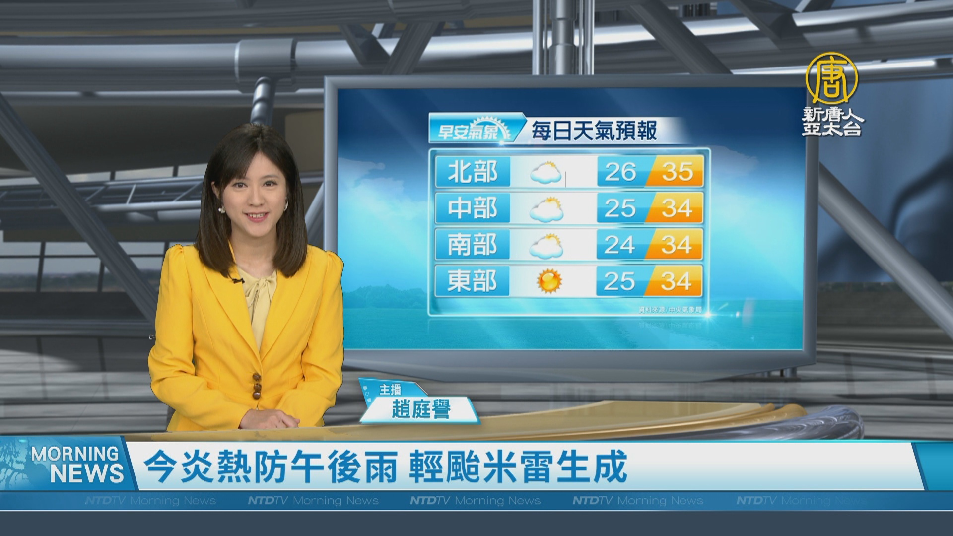【新唐人亞太台 2022 年 08 月 12 日訊】歡迎您收看8月12日的早安新唐人,我是趙庭譽,先來帶您關心天氣。位於日本附近海面熱帶性低氣壓今天凌晨兩點增強為輕度颱風,是今年第8號颱風「米雷」從路徑上來看,對台灣沒有直接影響。氣象局說,今天各地大多為多雲到晴,高溫炎熱,清晨西半部沿海地區仍有下雨的機會。帶您一起來看到國際媒體重要訊息。