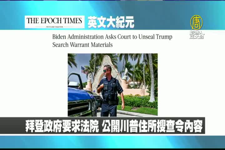 【新唐人亞太台 2022 年 08 月 12 日訊】首先來看到美國大紀元英文版報導:美國司法部要求聯邦法院,公開FBI本週前往川普佛州住所的搜查令內容。