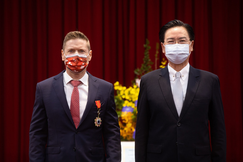 加拿大駐台代表芮喬丹(Jordan Reeves)(圖左)即將 卸任,外交部長吳釗燮(圖右)12日上午頒贈睦誼外交獎章。(圖/中央社)