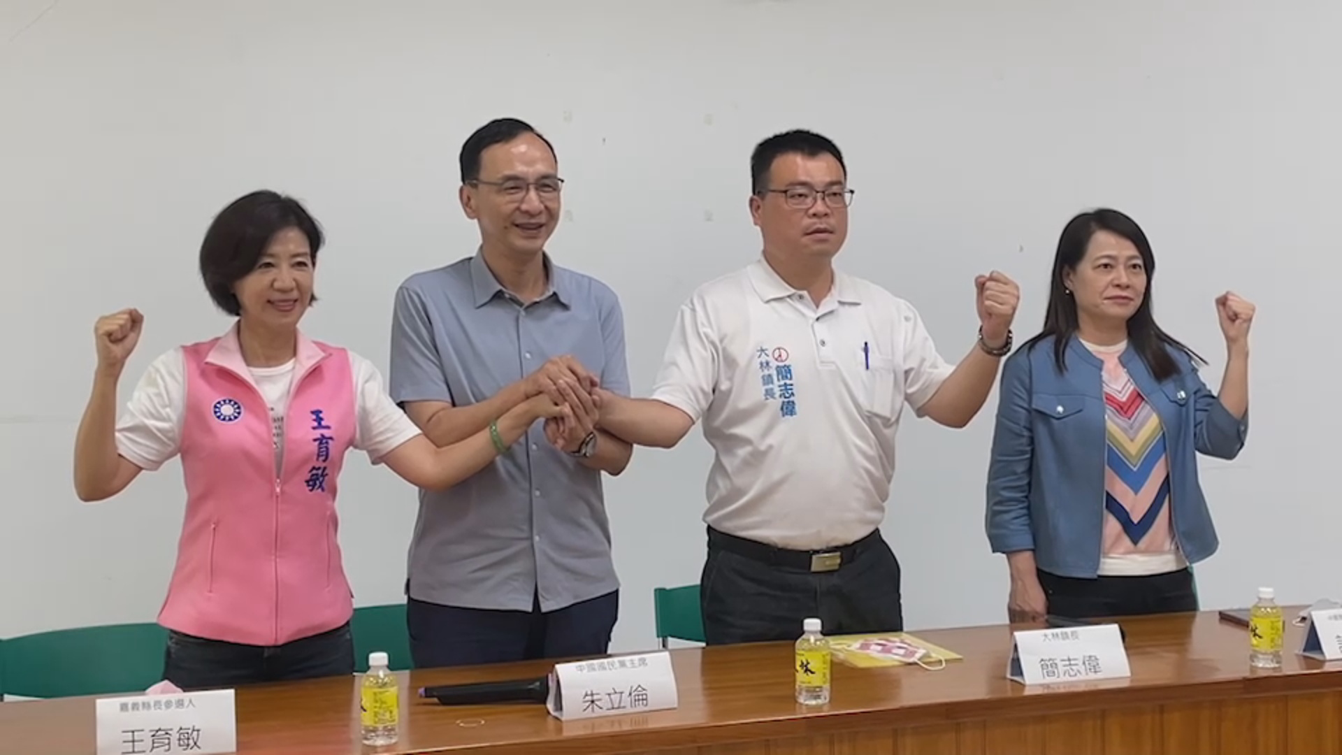 朱立倫今天與王育敏、國民黨中央組織發展委員會主委許宇甄到嘉義縣大林鎮公所,拜會無黨籍的簡志偉;大家會談後,一同開記者會,朱立倫、王育敏和簡志偉握手,高喊「王育敏凍蒜」、「簡志偉加油!」