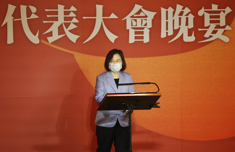 總統蔡英文14日晚間在台北君品酒店出席「藥師公會全國聯合會第15屆第1次會員代表大會」,蔡總統致詞時感謝藥師在疫情期間對國家的貢獻與付出。(圖/中央社)