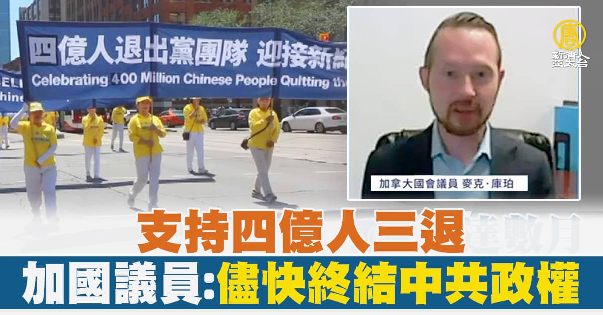 目前,全球已有四億多中國人公開聲明退出中共的黨團隊組織,加拿大國會議員庫珀(Michael Cooper)對此表示支持,並認為「三退運動」,推動了終結中共的政權。